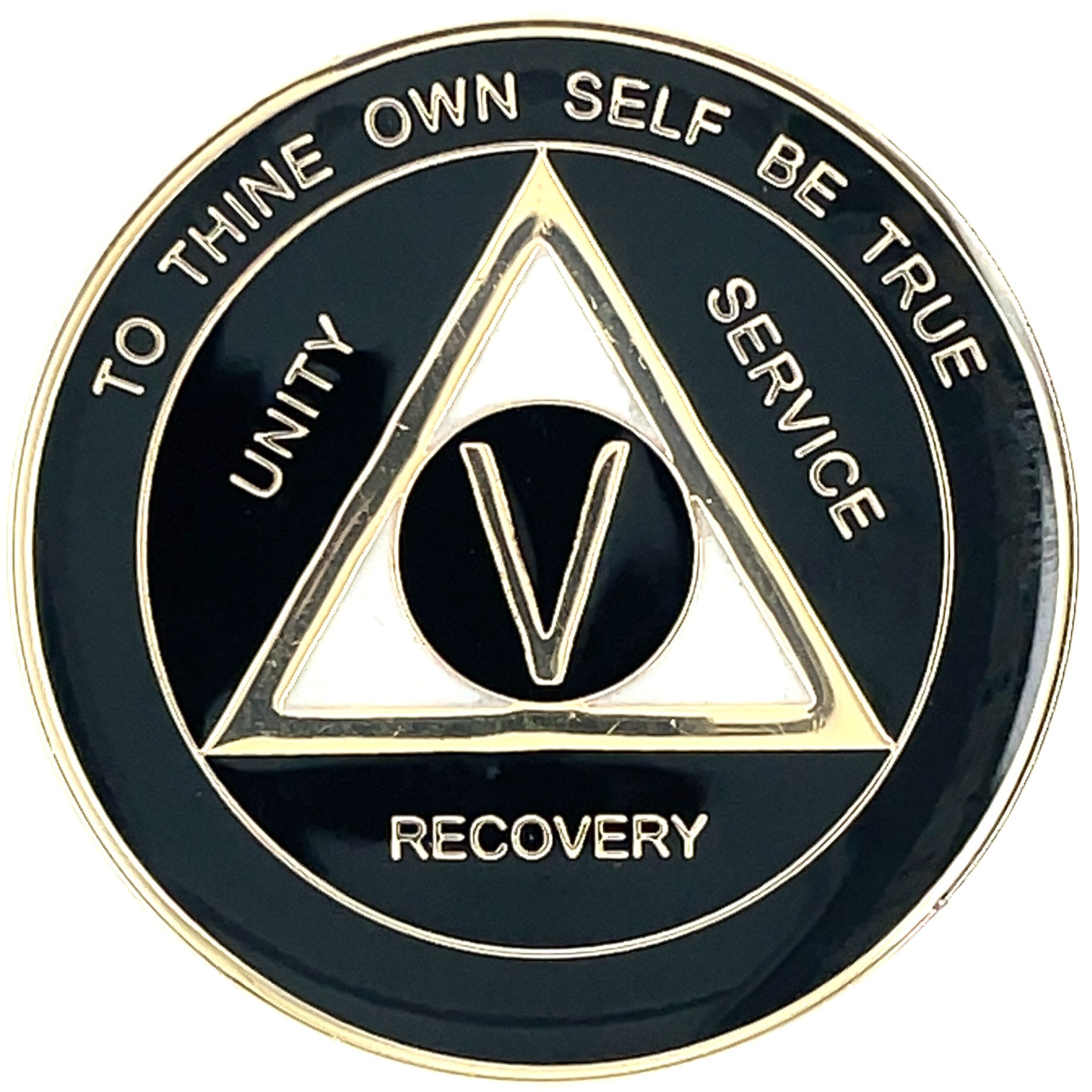 On the Front: To thine own self be true, Unity, Service, Recovery and the anniversary year in roman numerals.