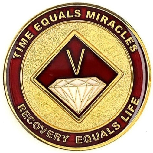 On the Front: Time equals miracles, Recovery equals life, and the anniversary year in roman numerals.